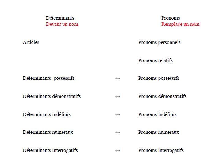 Les sous-familles n’ayant pas de correspondance sont les articles (définis et indéfinis) dans les déterminants et, dans les pronoms, les personnels et les relatifs.